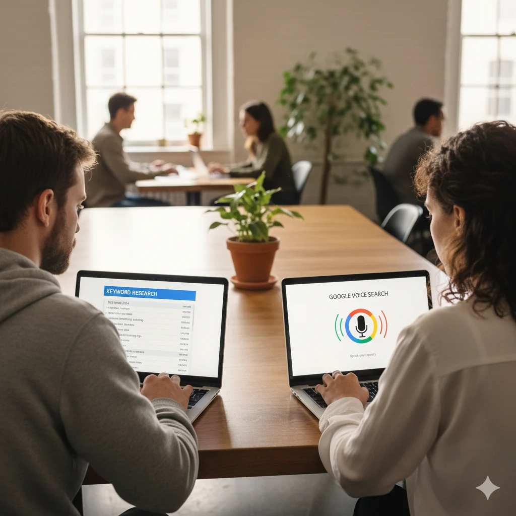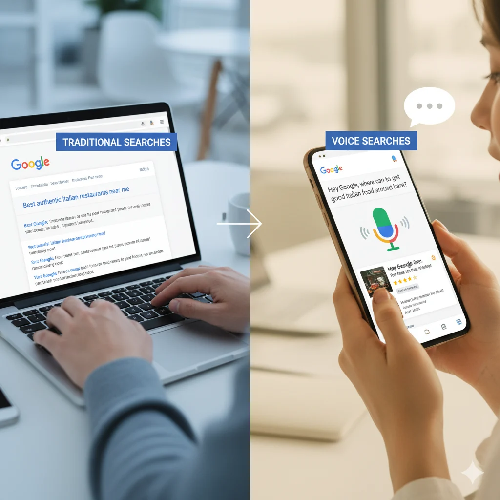 The biggest difference between traditional search and voice search lies in how people ask questions. Traditional search relies on short, keyword-based phrases, while voice search is much more conversational and question-based, similar to how we talk in real life.